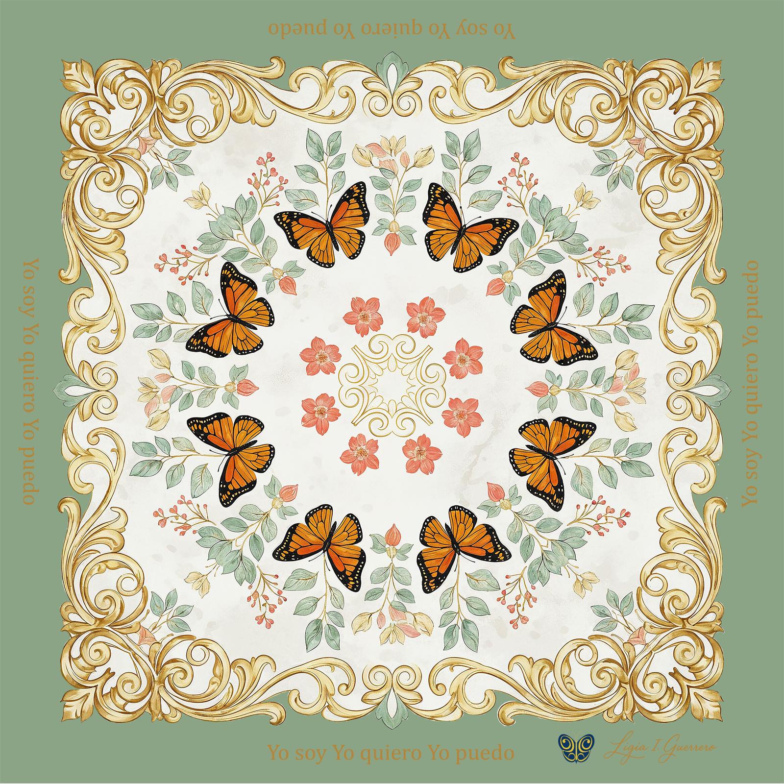 Eleva tu energía con este pañuelo inspirado en la transformación y la fuerza interior. Su mandala de mariposas monarca, flores suaves y detalles dorados refleja renacer, propósito y belleza espiritual.